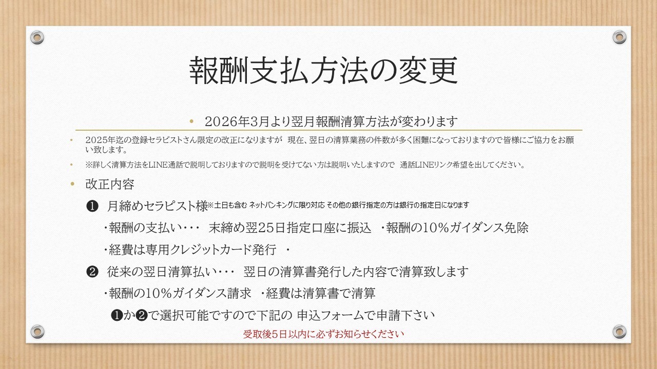 施術料金の集金は、責任をもってお客様から受け取り、各自管理してください。