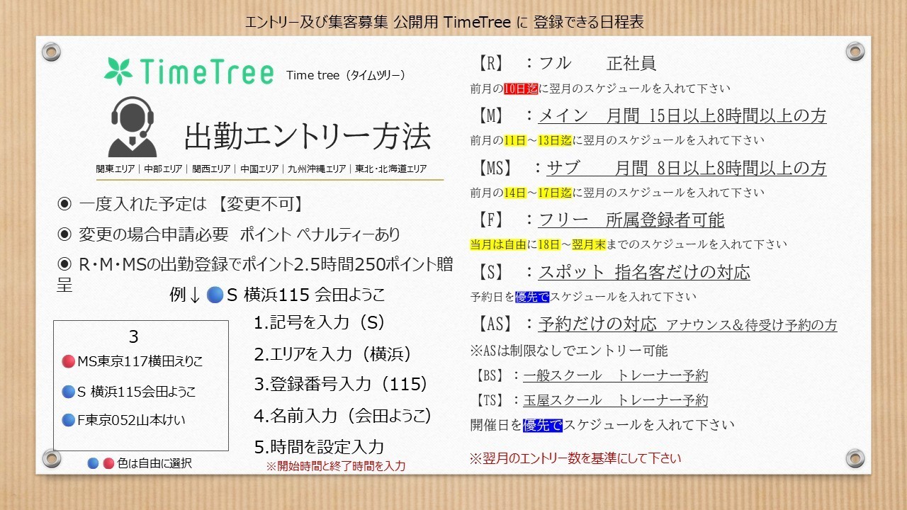 - ※ガイダンス料金は本来差し引かれるものですのでご理解の上Timetreeの入力(エントリー)は慎重に入れて下さい。