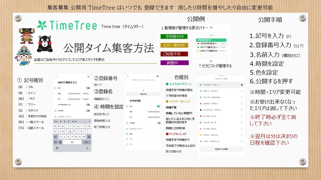 - ※時間を延ばす場合はLINEでお知らせ頂き確認後タイムツリーのメモに入力下さい。 許可が無いものは無効になります